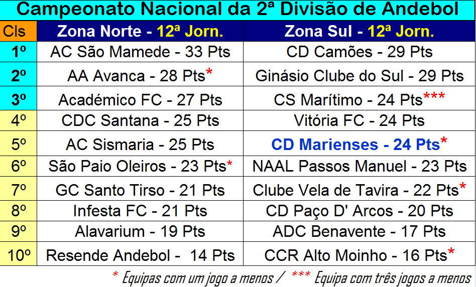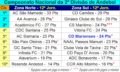 O Clube Desportivo "Os Marienses" vai entrar em 2012 na quinta posição da Zona Sul do Campeonato Nacional 2ª Divisão de Andebol. Isto porque alguns dos resultados registados este Sábado para a 12ª Jornada, tiveram influência directa na tabela classificativa fazendo o conjunto de Santa Maria baixar um lugar. Ressalve-se no entanto o adiamento de mais uma partida fora de portas por parte do CS Marítimo. A formação madeirense afinal parece não ter resolvidos os problemas de saneamento financeiro e já leva três jogos em atraso para o campeonato. Um deles diante do CD Marienses que está agendado para o dia 14 de Janeiro.