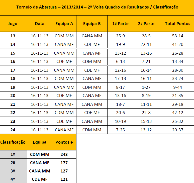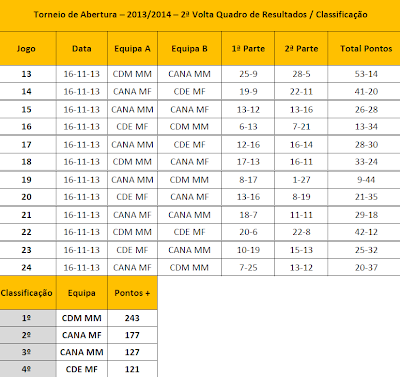 Na classificação, o Clube Desportivo "Os Marienses é líder nos dois escalões. Nos Infantis, segue em segundo lugar o GD de São Pedro que é último nos iniciados. Por último o GD Gonçalo Velho é terceiro nos infantis e segue na segunda posição nos iniciados.