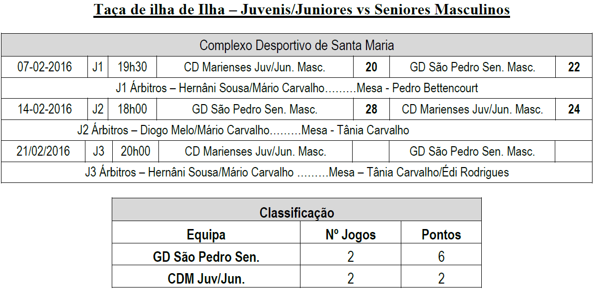 07 Jan. - 19h30 – Taça Ilha - Andebol - CD Marienses Juv/Jun. M. x GD São Pedro SM