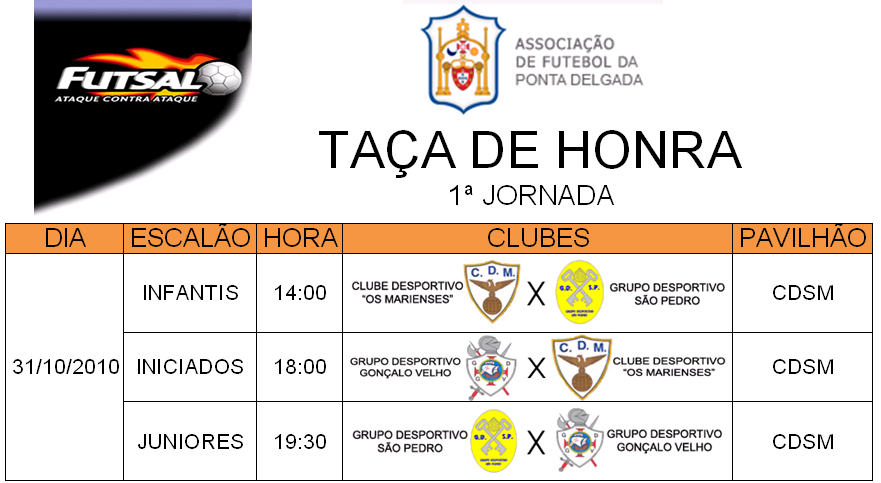 - Ultrapassadas que estão as divergências entre os clubes marienses, é aguardada com alguma espectativa o sorteio relativo à Taça de Honra de Futsal em Séniores Masculinos. Até lá, sabe-se apenas que a primeira jornada está agendada para o dia 6 de Novembro.